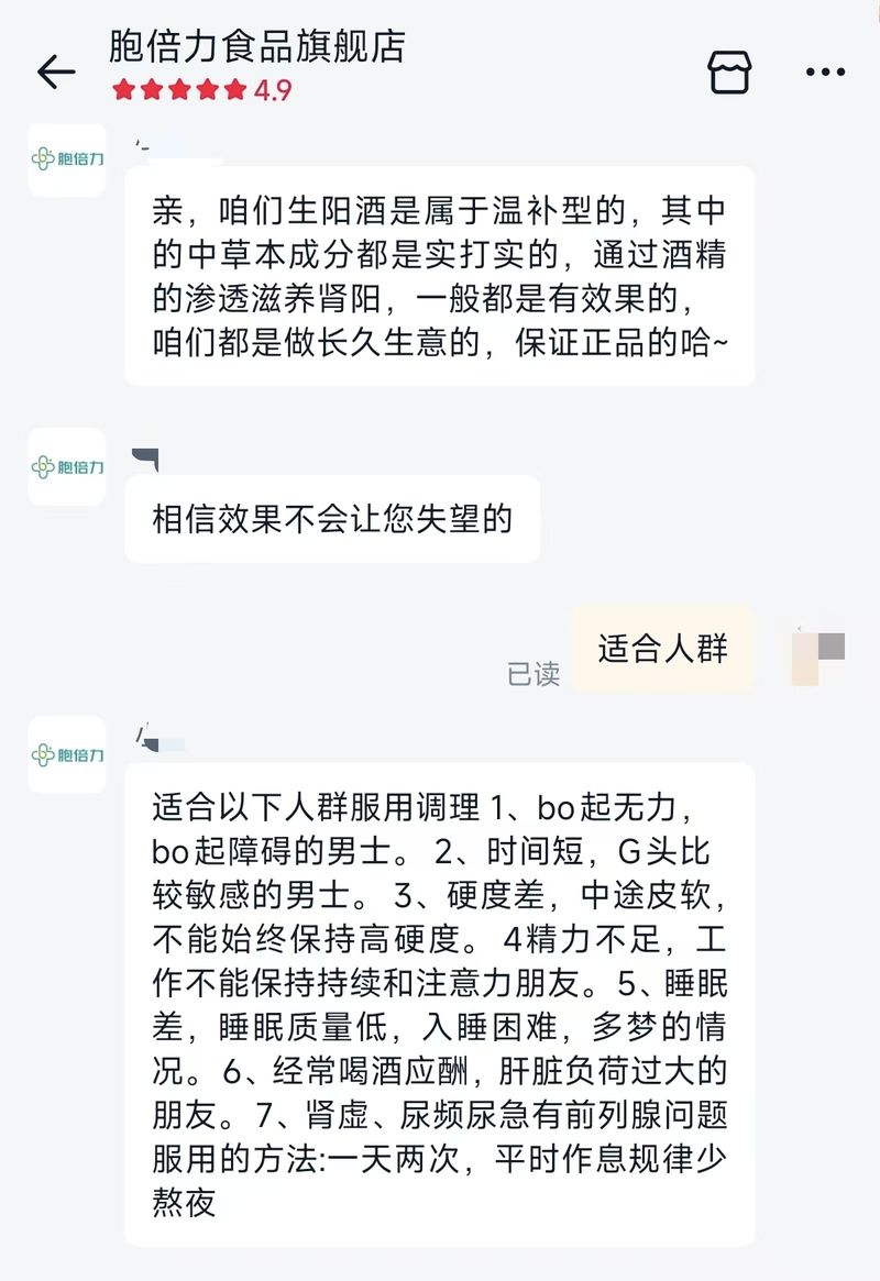 据客服宣称,这款“胞倍力生阳酒”适合多种人群服用调理,包括“bo起无力,bo起障碍的男士”并宣称适合男性性功能障碍、肾虚、尿频尿急等前列腺问题。服用方法为一天2次,每次服用25毫升,“一般情况7天就能感受到(效果),半个月会有比较明显变化。每个人的体质都不一样,建议亲自尝试一下,草本配方,温补不伤身。其中的中草本成分都是实打实的,通过酒精的渗透滋养肾阳,一般都是有效果的”。