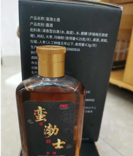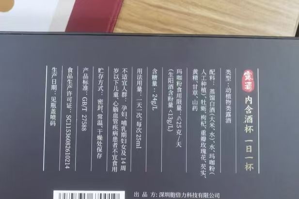 商家提供的产品信息显示,这款“蛮渤士酒”配料为清香型白酒、水、鹿鞭(养殖梅花鹿鹿鞭)、枸杞、大枣、玛咖粉、桑葚、黄精、牡蛎、人参(人工种植五年以下),执行标准同样为GB/T 27588-2011《露酒》标准,并非药酒或保健食品。