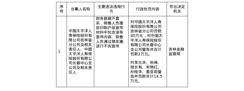 太平洋人寿吉林省分公司被罚40万,责任人共被罚14.5万