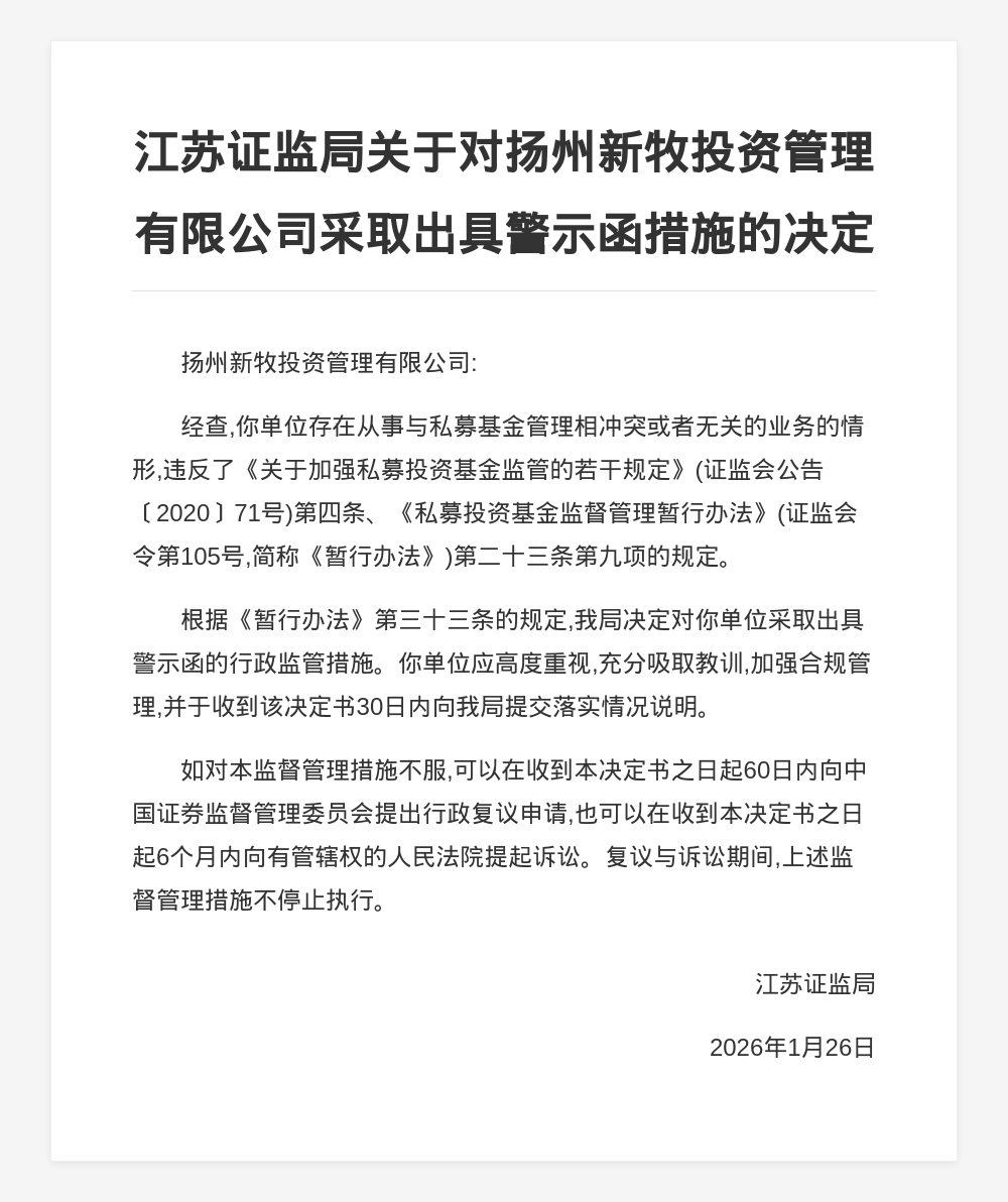 扬州新牧投资被出具警示函,涉从事与私募基金管理相冲突业务