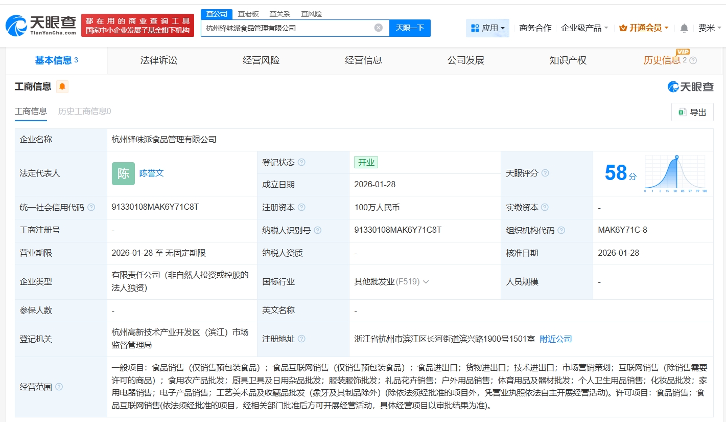 谢霆锋锋味派食品管理公司登记成立