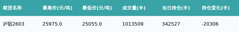 南财智讯1月29日电,盘后期货数据显示,上海期货交易所的沪铝主力合约收涨2.92%,收盘报25590.0元/吨,日内资金流入3.39亿元。其他相关指标见下表: