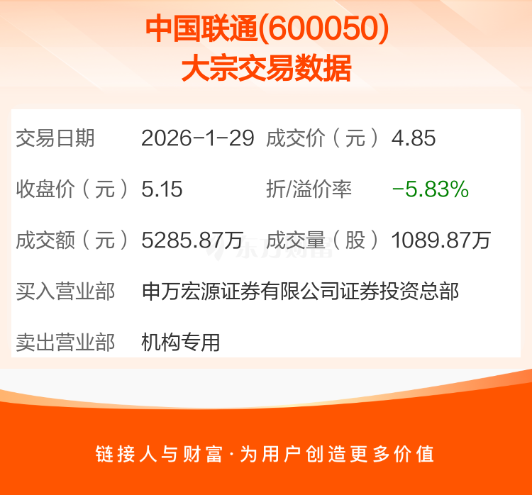 2026年1月29日,中国联通发生1笔大宗交易,共成交1089.87万股,成交金额5285.87万元,占其流通市值比例为0.03%。
