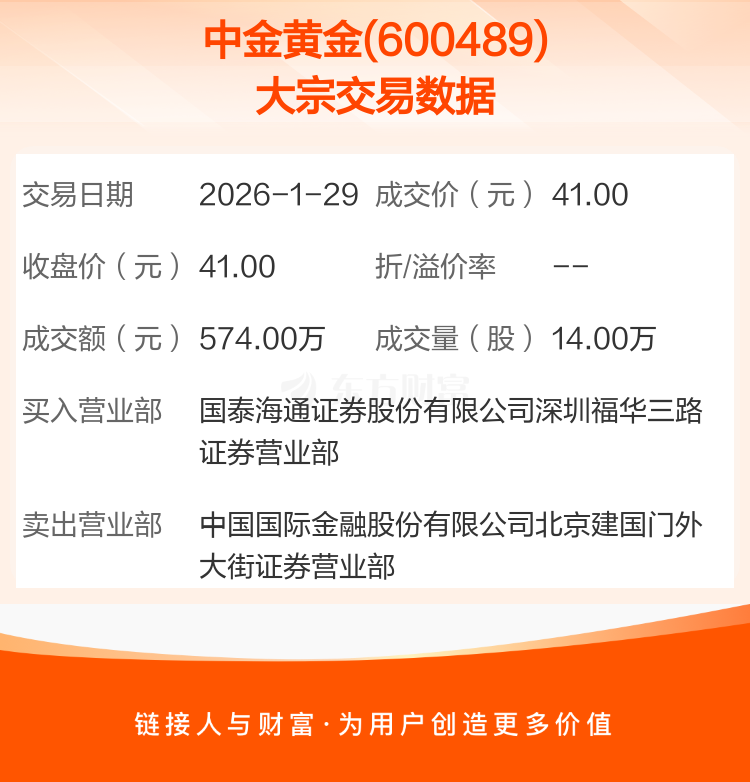 2026年1月29日,中金黄金发生1笔大宗交易,共成交14.00万股,成交金额574.00万元。