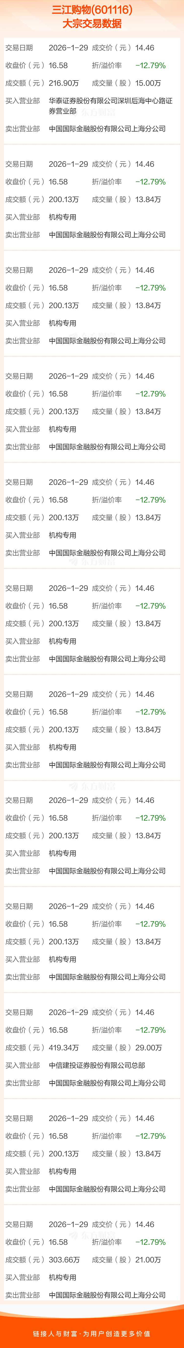 2026年1月29日,三江购物发生12笔大宗交易,共成交189.56万股,成交金额2741.07万元,占其流通市值比例为0.30%。