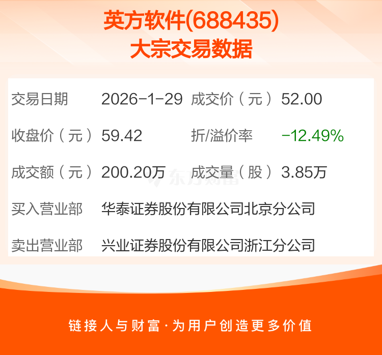 大宗交易:英方软件成交200.20万元,折价12.49%(1-29)