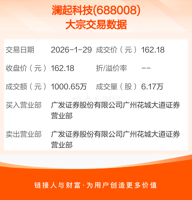 2026年1月29日,澜起科技发生1笔大宗交易,共成交6.17万股,成交金额1000.65万元。
