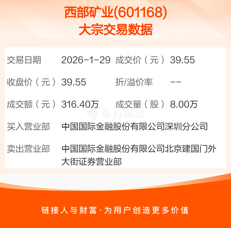 2026年1月29日,西部矿业发生1笔大宗交易,共成交8.00万股,成交金额316.40万元。