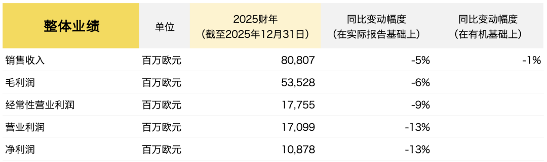 1月27日,LVMH发布2025 年财报,该集团依旧没有回到增长轨道,全年实现总营收 808 亿欧元,较2024年减少了38.76亿欧元(约合322.63亿元人民币)同比下降 5%,经常性营业利润和净利润均见下滑,同比下降9%和13%,分别为177.55 亿欧元和108.78 亿欧元,核心业务的营收修复节奏仍未达预期。