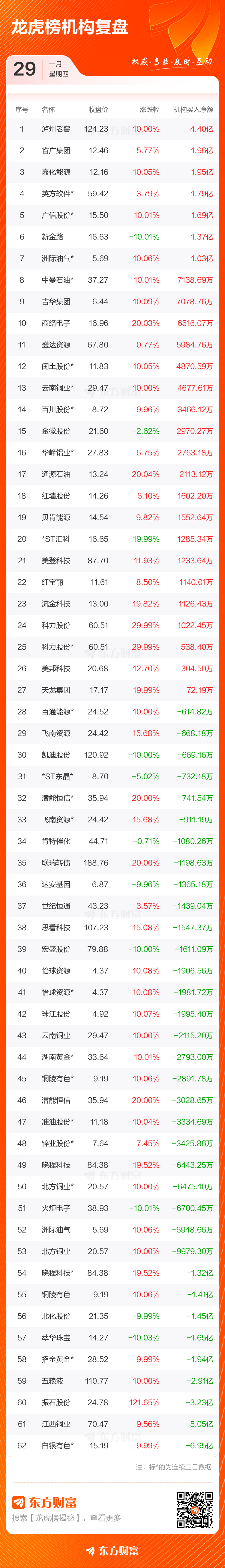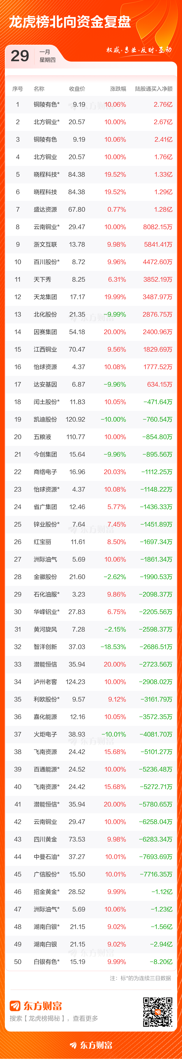 1月29日龙虎榜复盘:铜陵有色净买额居首
