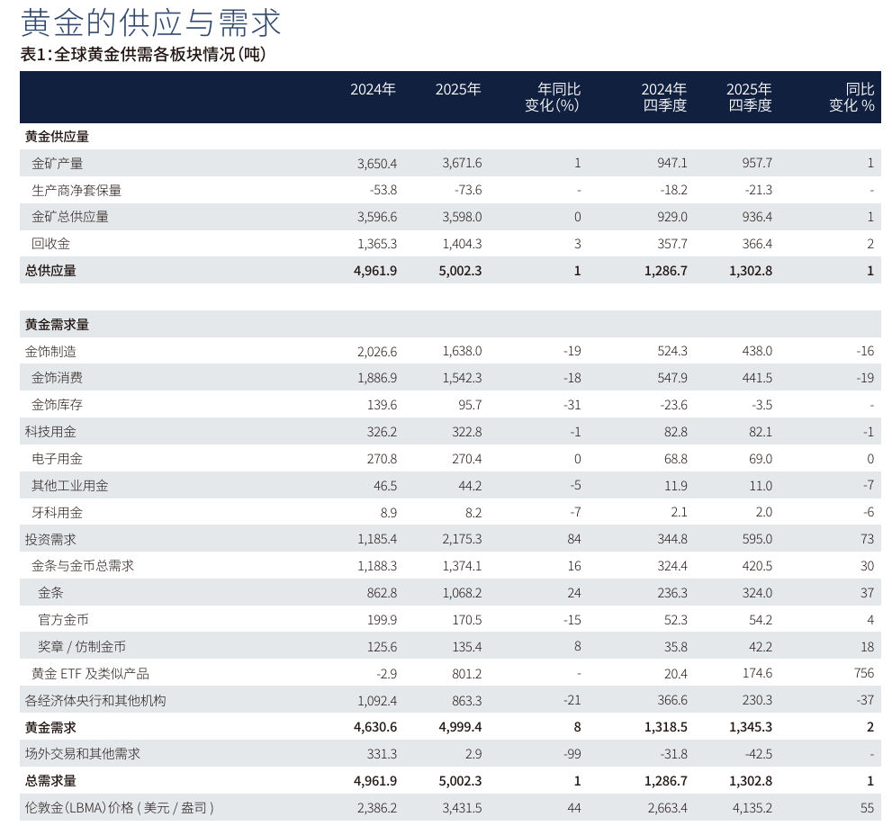 具体来看,全球黄金投资需求增至2175吨的里程碑水平,成为推动2025年黄金总需求刷新历史纪录的主要驱动力。全球范围内,寻求避险和资产多元化的投资者大量涌入黄金ETF,全年净增801吨,成为历史第二高年度增量。