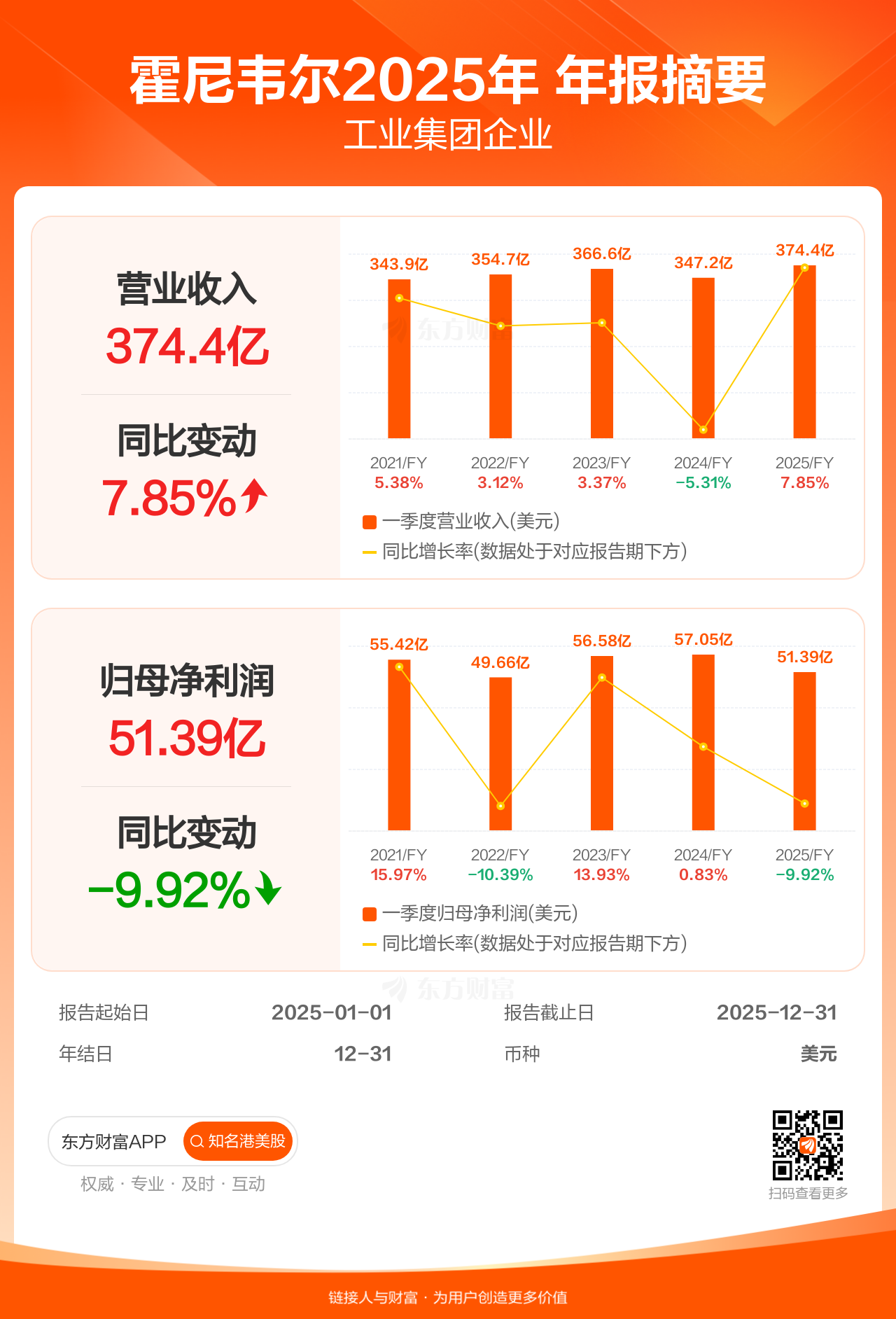 霍尼韦尔1月29日发布年报业绩,截至2025年12月31日的12个月内,该公司营业收入374.42亿美元,同比增长7.85%;公司权益持有人应占溢利(归母净利润)51.39亿美元,同比减少9.92%。