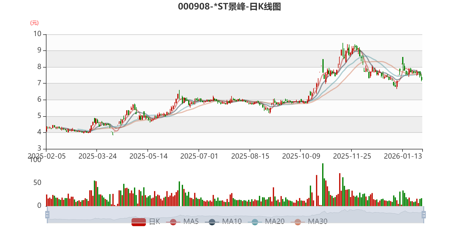 中证智能财讯 *ST景峰(000908)1月29日晚间披露2025年度业绩预告,预计2025年实现营业收入3.6亿元至4.2亿元;归母净利润亏损6000万元至9000万元,上年同期盈利1.52亿元;扣非净利润亏损4300万元至6400万元,上年同期亏损7611.79万元;基本每股收益-0.0682元/股至-0.1023元/股。以最新收盘价计算,市净率(LF)约170.54倍,市销率(TTM)约16.31倍。