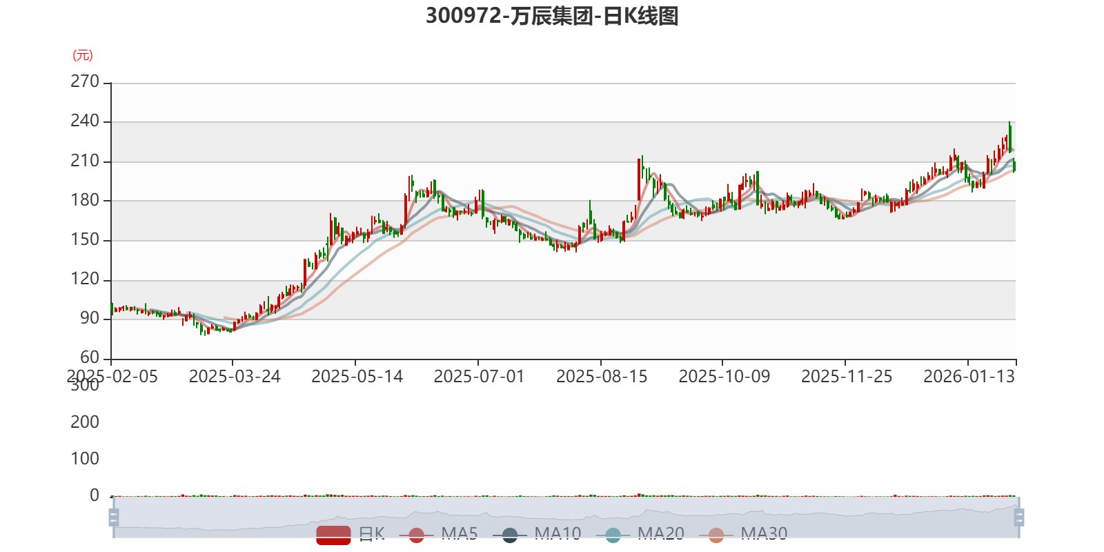 中证智能财讯万辰集团(300972)1月29日晚间披露2025年度业绩预告,预计2025年实现营业收入500亿元至528亿元;归母净利润12.3亿元至14亿元,同比增长222.38%-266.94%;扣非净利润预计11.6亿元至13.3亿元,同比增长245.02%-295.58%。以1月29日收盘价计算,万辰集团目前市盈率(TTM)约为27.42倍-31.21倍,市净率(LF)约18.85倍,市销率(TTM)约0.75倍。