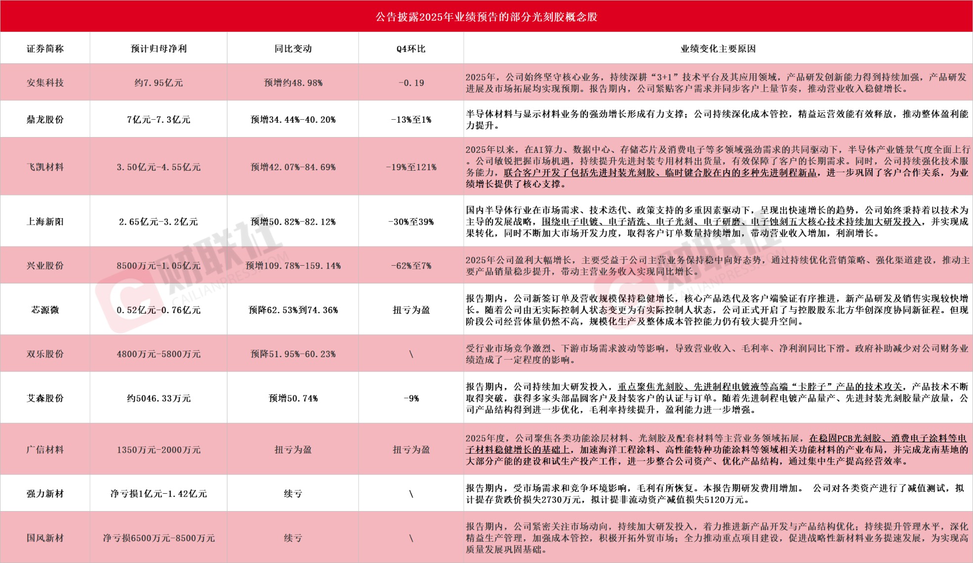 十余只光刻胶概念股披露2025年业绩预告 飞凯材料Q4环比最高预增121%