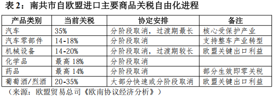 对南共市而言,保护本国制造业是其协定谈判的重要考量。因此,南共市坚持要求为汽车及零部件、机械设备、化学品等核心工业品设置了较长的降税过渡期(见表2)。例如,目前税率高达35%的汽车,其关税将在最长过渡期内分阶段取消。这种安排旨在为南共市的工业体系提供充分的调整和缓冲时间,以应对外部竞争。整体而言,欧盟通过有限、可控地开放农产品市场,换取南共市对其高附加值工业品市场的实质性、渐进式开放。
