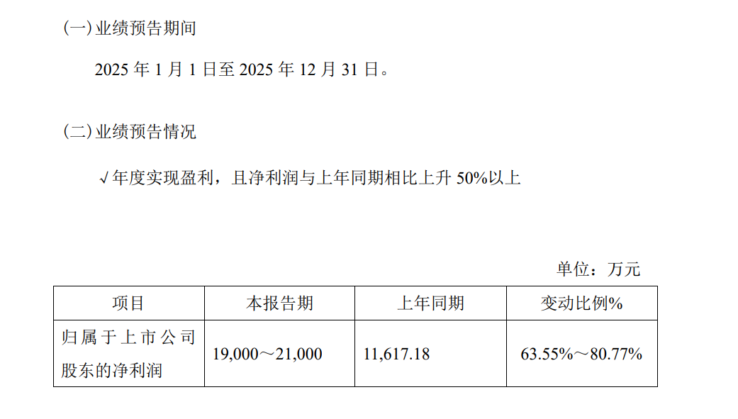 日前,广信科技发布2025年度业绩预告,公司全年业绩迎来大幅增长,预计实现归属于上市公司股东的净利润1.9亿元至2.1亿元,同比增长63.55%至80.77%。