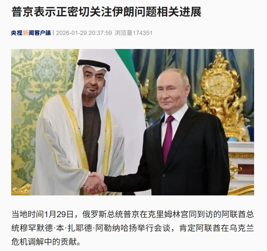 当地时间1月29日,俄罗斯总统普京在克里姆林宫同到访的阿联酋总统穆罕默德·本·扎耶德·阿勒纳哈扬举行会谈,肯定阿联酋在乌克兰危机调解中的贡献。