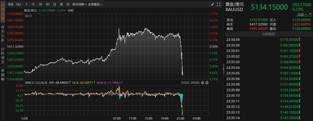 现货黄金日内跌幅超5%,逼近5100美元/盎司。