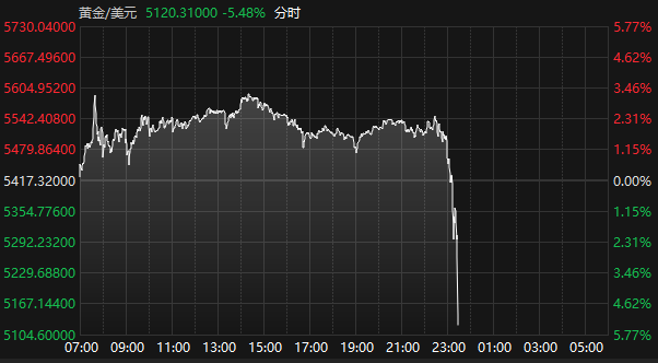 上证报中国证券网讯(记者张骄)1月29日晚间,现货黄金白银大幅跳水,回吐盘中全部涨幅。截至23时28分,伦敦现货黄金报5120.31美元/盎司,跌超5%,盘中一度涨超3%;伦敦现货白银报108.321美元/盎司,跌超7%,盘中一度涨超4%。