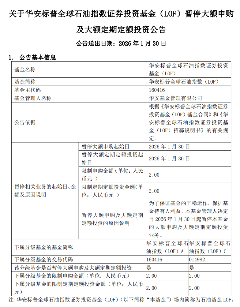 石油基金LOF:自1月30日起暂停大额申购及大额定期定额投资业务,每日累计投资限额降至2万元。