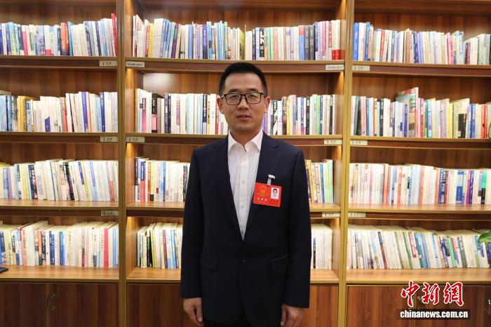 山东省十四届人大四次会议代表集中采访活动上,山东省人大代表、潍坊经济开发区双杨街道前阙庄村党支部书记于英智讲述村里的致富故事。王采怡摄
