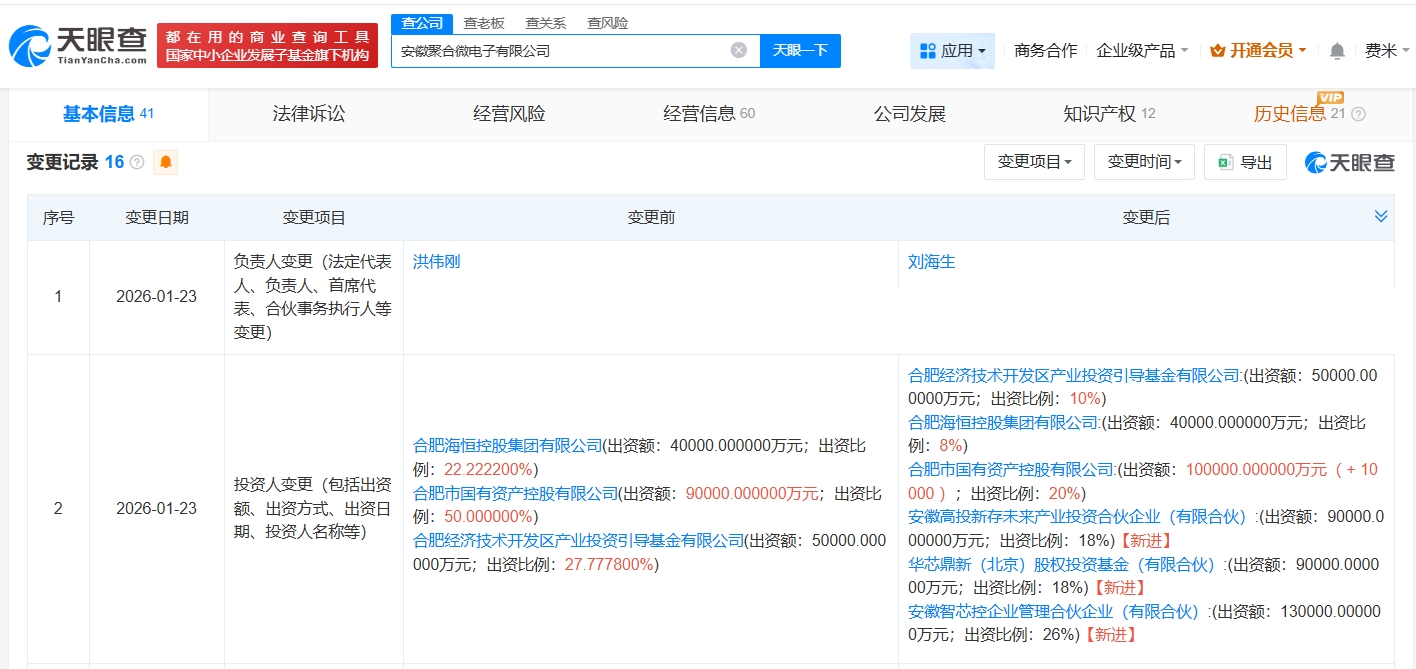 南方财经1月29日电,天眼查工商信息显示,近日,安徽聚合微电子有限公司发生工商变更,新增国家大基金三期旗下华芯鼎新(北京)股权投资基金(有限合伙)、安徽高投新存未来产业投资合伙企业(有限合伙)、安徽智芯控企业管理合伙企业(有限合伙)为股东,洪伟刚卸任法定代表人,由刘海生接任,注册资本由18亿人民币增至50亿人民币,同时,多位主要人员发生变更。安徽聚合微电子有限公司成立于2024年8月,经营范围包括集成电路设计、集成电路芯片及产品制造、集成电路芯片及产品销售等。股东信息显示,该公司现由合肥市国有资产控股有限公司、合肥经济技术开发区产业投资引导基金有限公司及上述新增股东等共同持股。