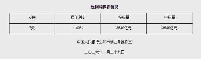 中新网1月29日电据央行网站消息,2026年1月29日中国人民银行以固定利率、数量招标方式开展了3540亿元7天期逆回购操作。具体情况如下: