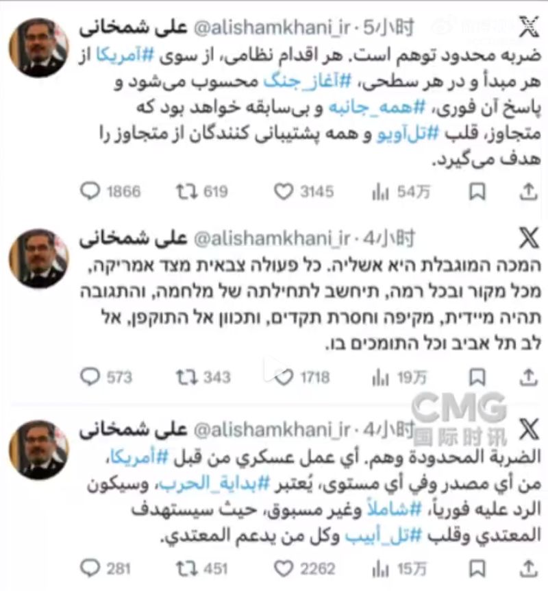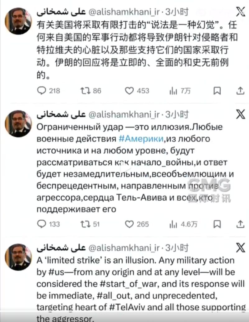 据CCTV国际时讯官方微博,当地时间1月28日晚,哈梅内伊的政治顾问阿里·沙姆哈尼在社交媒体用波斯语、阿拉伯语、希伯来语、英文、中文、俄文等多种语言发文说,所谓美国将采取“有限打击”的说法是一种“幻觉”——伊朗将把任何来自美国的军事行动视为战争开始,并立即实施全面且空前的反击,目标是“特拉维夫(以色列中部城市)的心脏”和所有支持侵略的相关方。