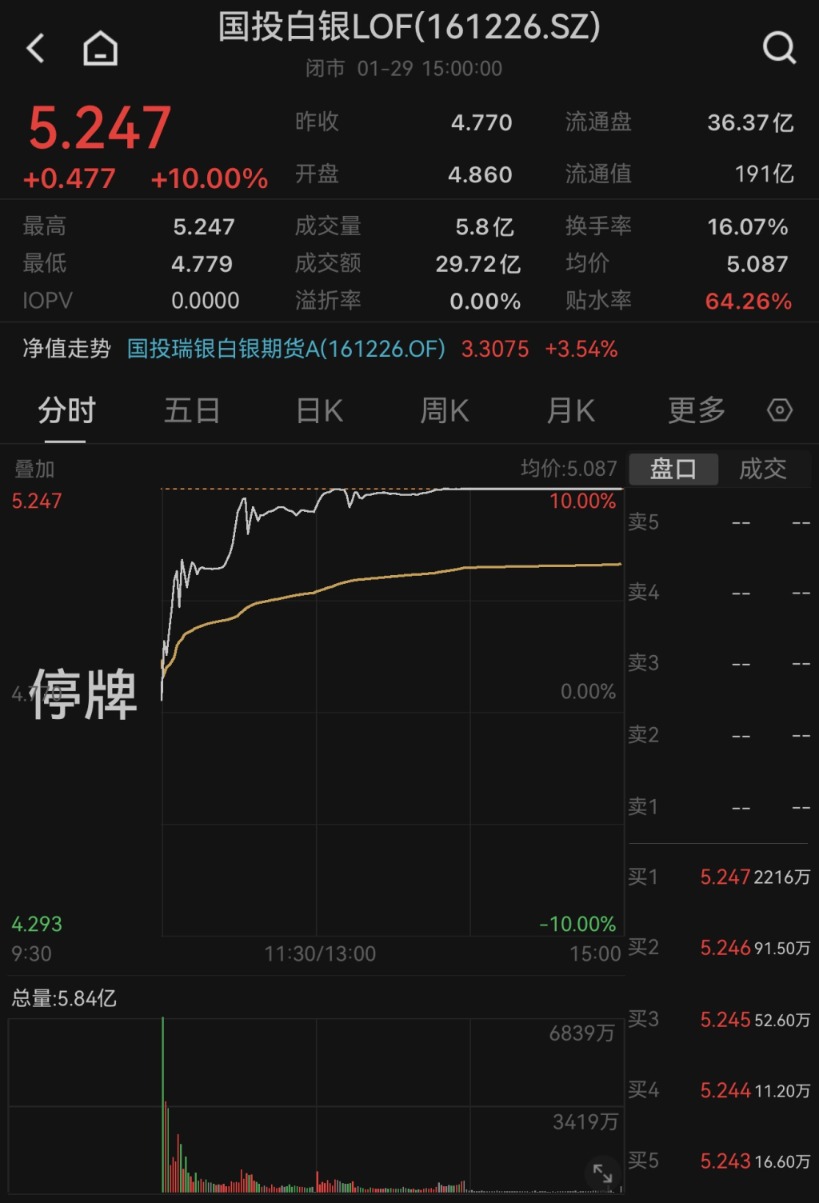 截至1月29日收盘,国投白银LOF连续第二个交易日涨停,场内价格相较于基金净值的溢价率已高达64%。