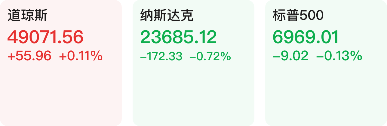 当地时间1月29日,美股三大指数收盘涨跌不一,纳指跌0.72%,标普500指数跌0.13%,道指涨0.11%。大型科技股走势分化,微软跌近10%,特斯拉跌超3%,甲骨文跌超2%;Meta涨超10%,苹果、谷歌、英伟达小幅上涨。