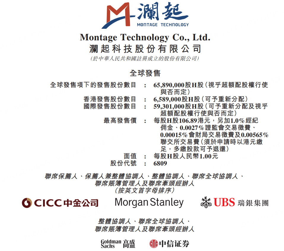 澜起科技发布公告,于1月30日至2月4日招股,公司拟全球发售6589万股,每股发售价不高于106.89港元,每手100股,入场费10796.8港元,中金公司、摩根士丹利及瑞银集团为联席保荐人,预计将于2月9日开始在港交所挂牌交易。
