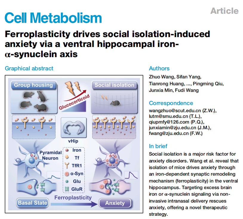 南方财经记者从华南理工大学获悉,近日该校医学院王卓副教授团队联合浙江大学、南方医科大学等单位,在国际顶级期刊Cell Metabolism(《细胞·代谢》)发表原创性研究成果。该研究首次揭示了社交隔离会触发大脑特定区域的“铁堆积”,进而激活一条全新的神经可塑性通路——研究团队将其命名为“铁可塑性”(Ferroplasticity)。