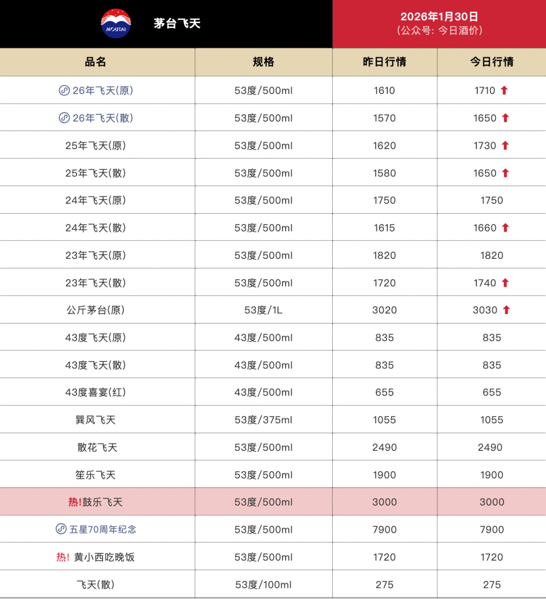 其中,26年飞天茅台原箱较前一日上涨100元,报1710元/瓶;26年飞天茅台散瓶较前一日上涨80元,报1650元/瓶。