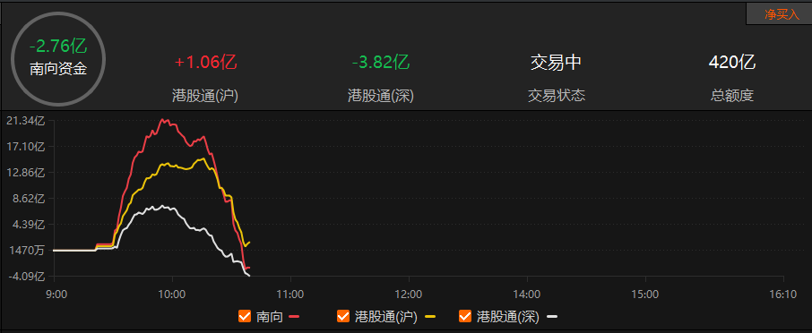 上证报中国证券网讯 1月30日10时39分,南向资金转为净卖出,卖出额为2.76亿港元,此前南向资金一度净买入超20亿港元。