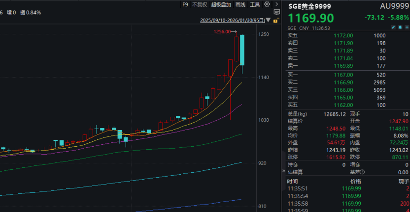 消息面上,金银价格在连续大涨后,最近两个交易日开始剧烈波动。今天上午,上海黄金交易所黄金Au99.99合约价格重挫,盘中跌幅一度超过7%,上述合约盘中最低至1148.01元/克,较上一交易日盘中最高价下跌超过100元/克。