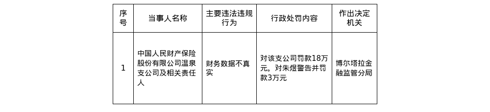 罚单显示,中国人民财产保险股份有限公司温泉支公司的主要违法违规事实为:财务数据不真实。