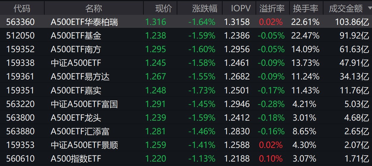 截至上午收盘,场内跟踪中证A500指数的ETF跌超1%。其中,有11只中证A500相关ETF成交额超1亿元,2只超91亿元。A500ETF华泰柏瑞、A500ETF基金早盘成交额分别为103.86亿元、91.92亿元。