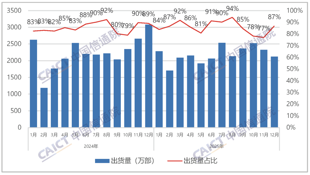 2025年1-12月,国内市场手机出货量3.07亿部,同比下降2.4%,其中,5G手机2.66亿部,同比下降1.9%,占同期手机出货量的86.9%。