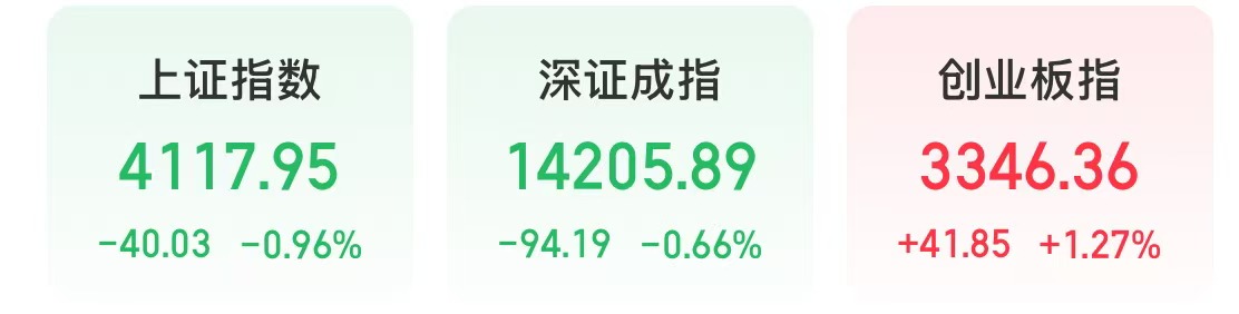 今天,A股分化。截至收盘,上证指数下跌0.96%,深证成指下跌0.66%,创业板指上涨1.27%。