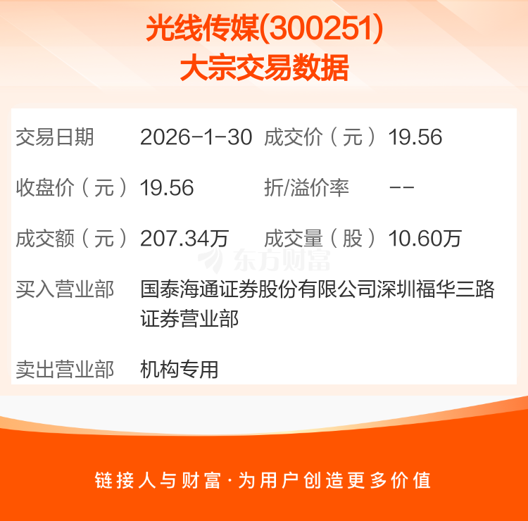 2026年1月30日,光线传媒发生1笔大宗交易,共成交10.60万股,成交金额207.34万元。
