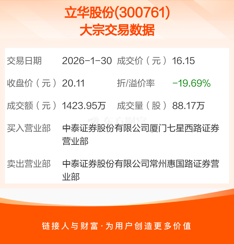 2026年1月30日,立华股份发生1笔大宗交易,共成交88.17万股,成交金额1423.95万元,占其流通市值比例为0.11%。