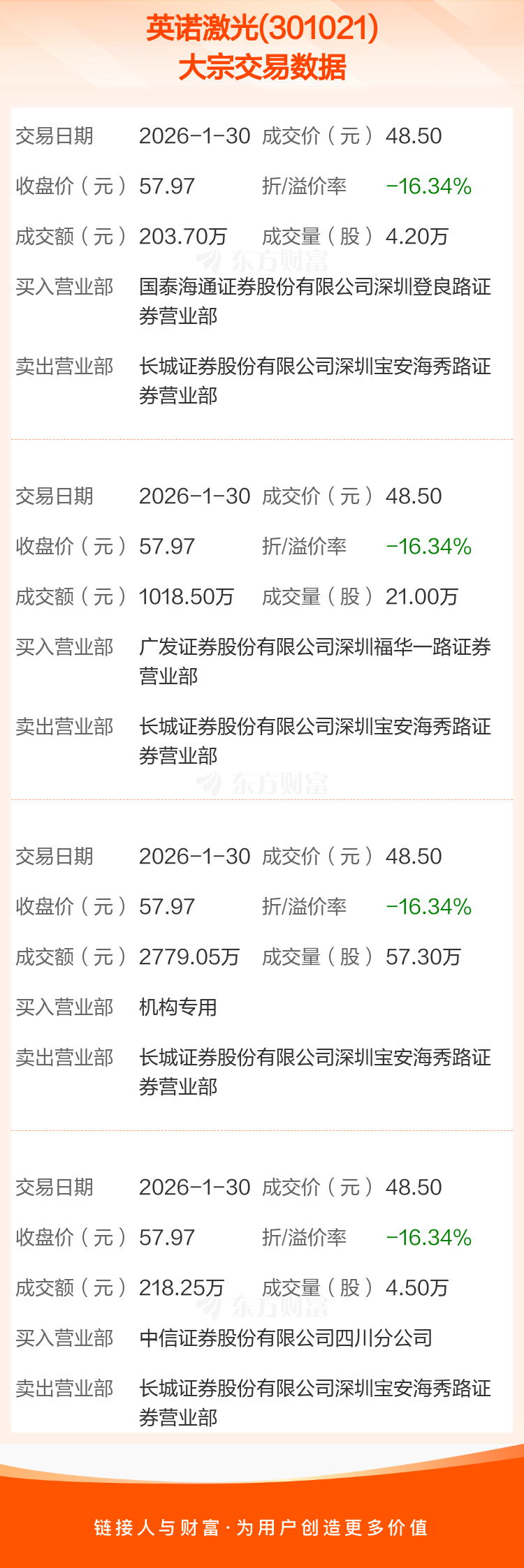 4笔大宗交易成交均价48.50元,较该股当日收盘价57.97元折价16.34%。