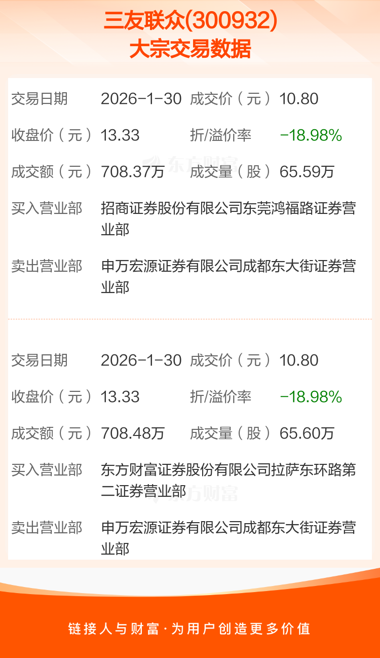 2026年1月30日,三友联众发生2笔大宗交易,共成交131.19万股,成交金额1416.85万元,占其流通市值比例为0.47%。