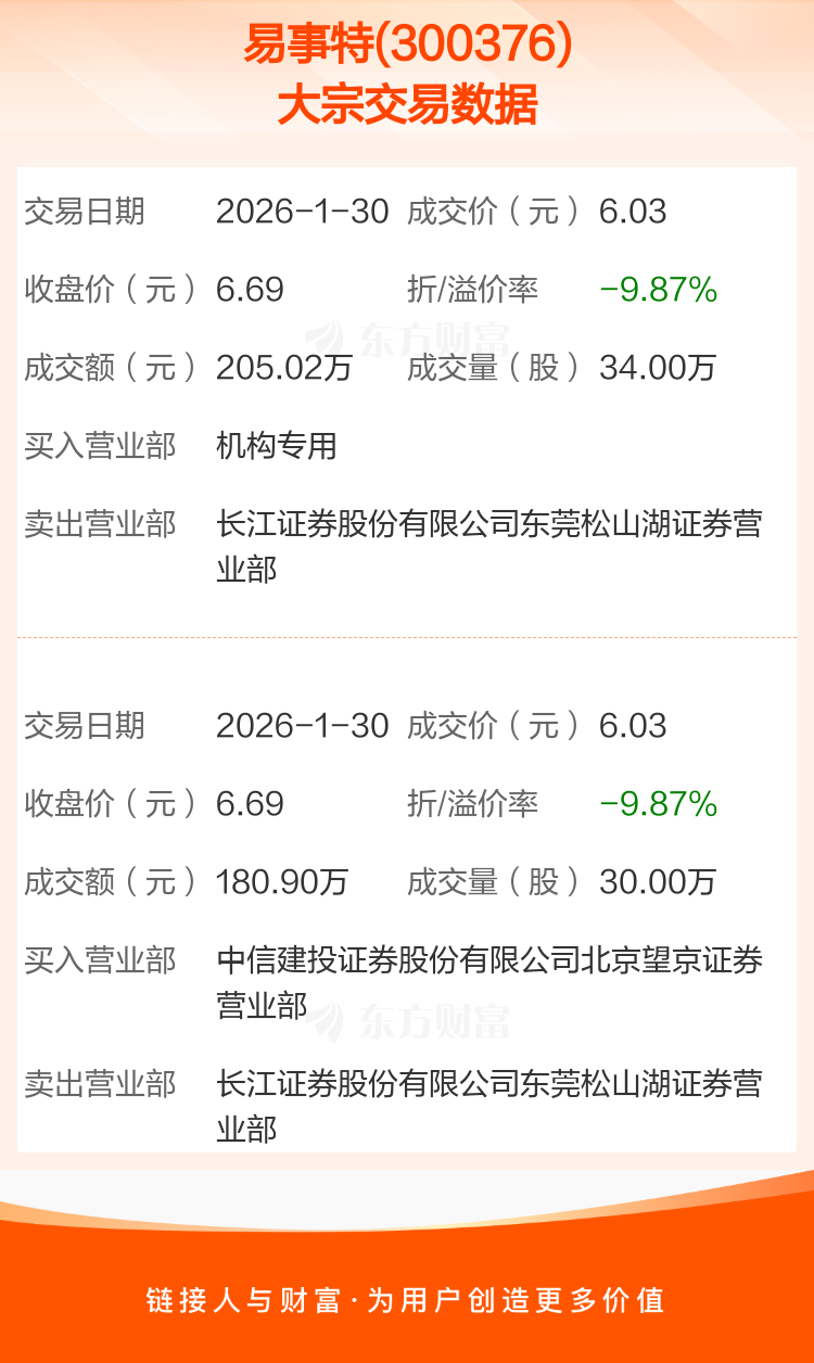 2026年1月30日,易事特发生2笔大宗交易,共成交64.00万股,成交金额385.92万元,占其流通市值比例为0.02%。