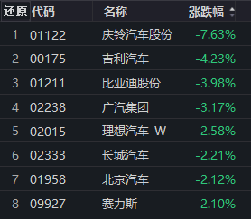 汽车板块持续走弱,庆铃汽车股份跌近7%,吉利汽车、比亚迪股份等跟跌。