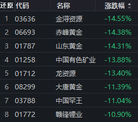 金属与采矿概念全天下跌,金浔资源、赤峰黄金、山东黄金均跌超14%。消息面上,现货黄金失守5200美元/盎司。同时国内有色金属期货主力合约集体回踩,钯、铂跌超11%,碳酸锂跌停,跌幅11%,沪锡跌超8%,多晶硅、沪银跌超6%,沪金、铝合金跌超4%,沪镍跌近4%,沪铝跌超3%,国际铜、沪铜、不锈钢跌超2%。