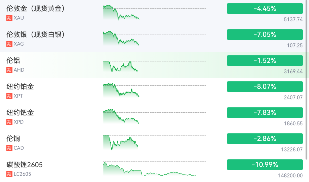 截至发稿,伦敦金跌4.45%,伦敦银跌7.05%,伦铝跌1.52%,伦铜跌2.86%,纽约铂跌8.07%,纽约钯跌7.83%。
