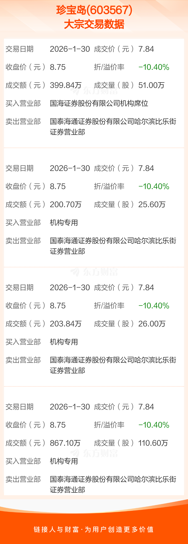 2026年1月30日,珍宝岛发生4笔大宗交易,共成交213.20万股,成交金额1671.48万元,占其流通市值比例为0.20%。