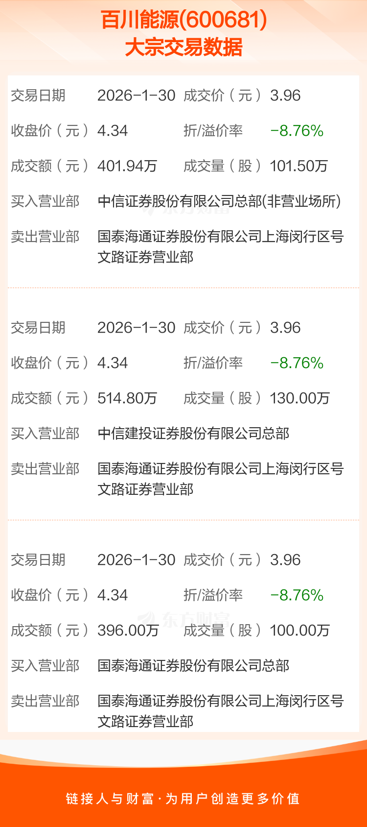 2026年1月30日,百川能源发生3笔大宗交易,共成交331.50万股,成交金额1312.74万元,占其流通市值比例为0.23%。